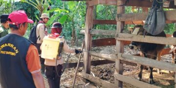 Kegiatan yang dilakukan adalah membagikan obat cacing ternak sapi kepada para peternak sekaligus membantu melakukan penyemprotan desinfektan ke kandang sapi milik para peternak.