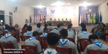 PRAMUKA.ID – Ketua Kwarnas Gerakan Pramuka kak Komjen (Purn) Drs. H. Budi Waseso diwakili Waka Kwarnas Bidang Aset dan Usaha kak Yulius, ST resmi menutup kegiatan Bimbingan Teknis (Bimtek) Pengembangan Kewirausahaan dan Penciptaan Wirausaha dalam Gerakan Pramuka pada Jum’at (8/11/2024) malam di Aula Pusdiklat Kwarda Lampung, Bandar Lampung.