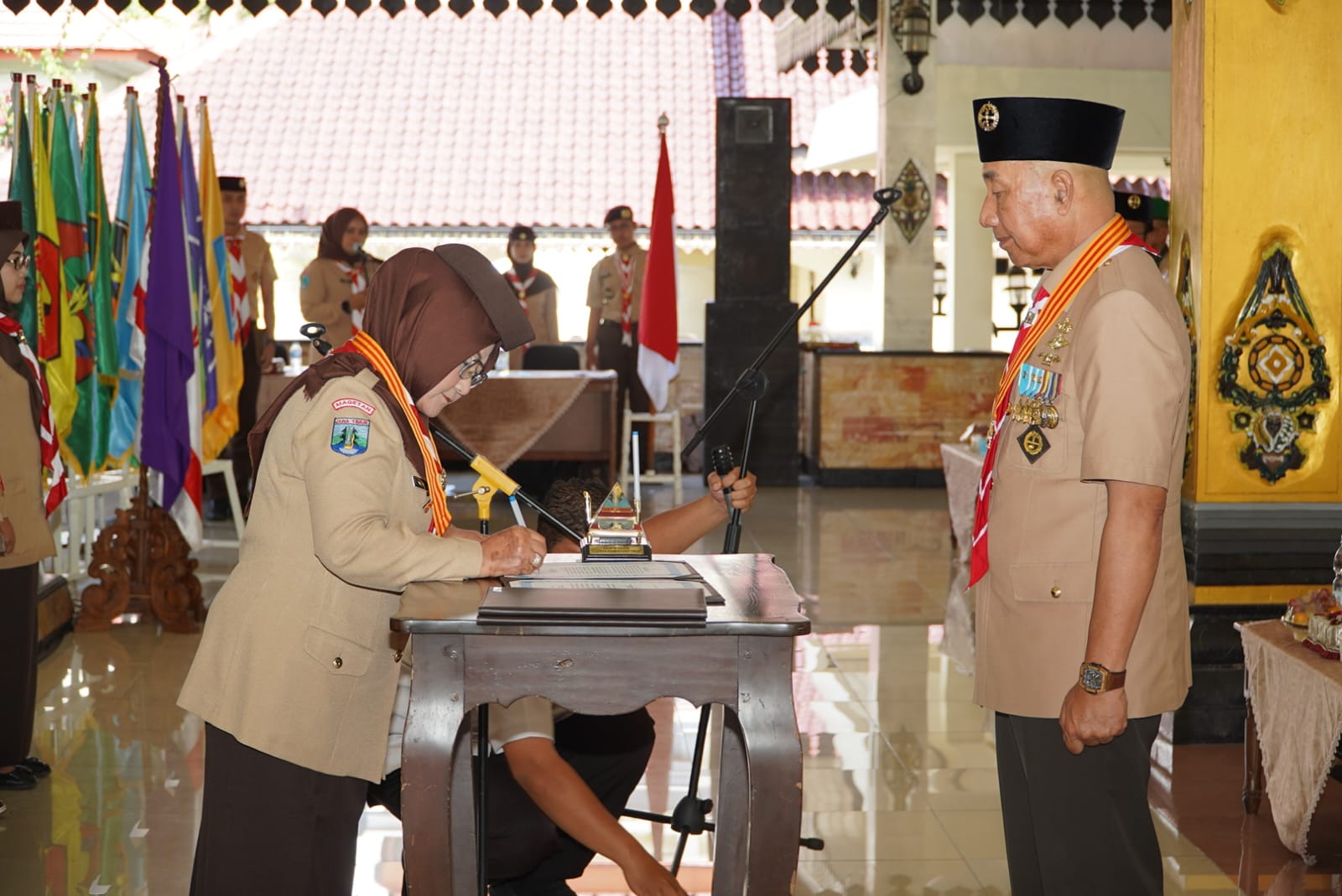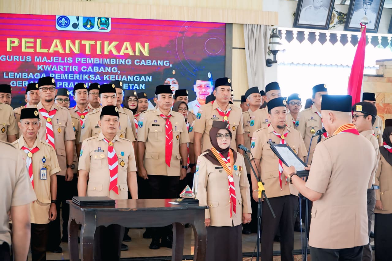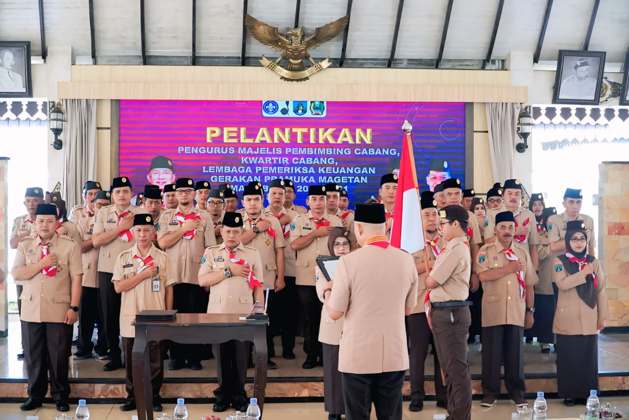 PRAMUKA.ID – Magetan, Ketua Kwartir Daerah Gerakan Pramuka Jawa Timur Kak H. M. Arum Sabil, S.P., S.H., M.KL resmi melantik Bupati Magetan Kak Hj. Nanik Endang Rusminarti, M.Pd. sebagai Ketua Majelis Pembimbing Cabang Gerakan Pramuka Magetan Masa Bakti 2025-2030. Prosesi pelantikan berlangsung khidmat pada Rabu, 29 April 2026 di Pendapa Surya Graha Kabupaten Magetan.