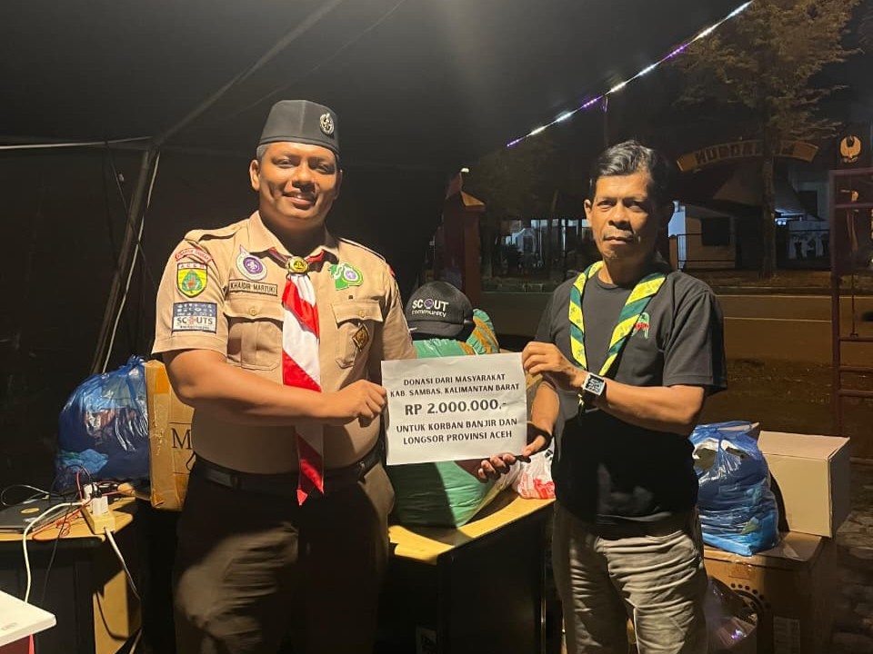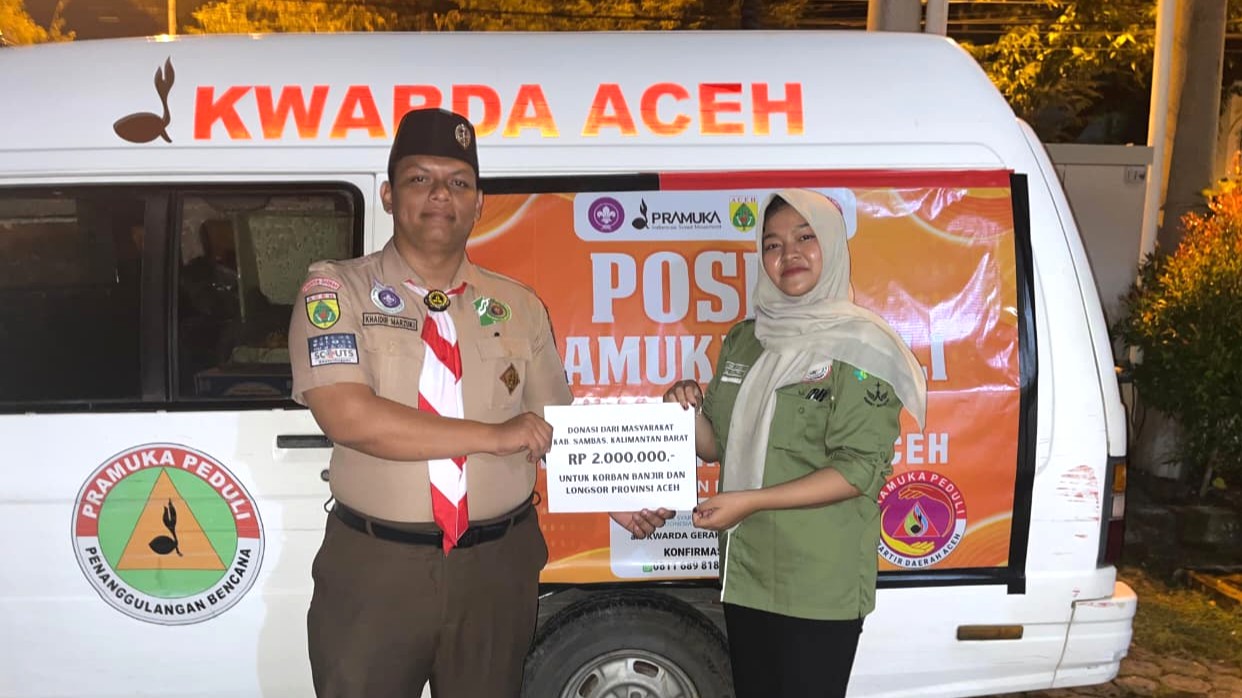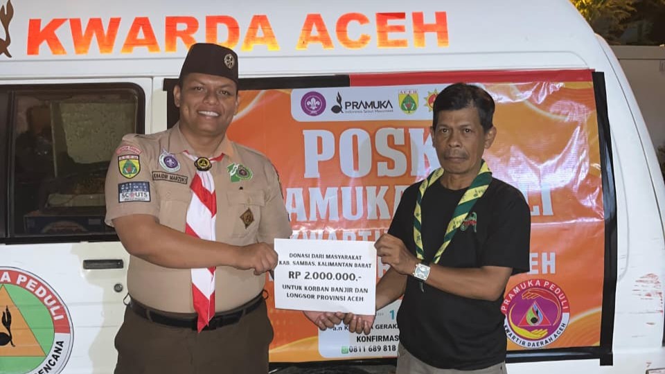 PRAMUKA.ID – Banda Aceh — Jumat, 5 Desember 2025. Kepedulian masyarakat Kabupaten Sambas, Kalimantan Barat, diwujudkan melalui penyaluran donasi bagi korban bencana banjir dan longsor yang melanda sejumlah wilayah di Provinsi Aceh. Bantuan tersebut berupa uang tunai sebesar Rp 2.000.000, yang disalurkan melalui Pramuka Peduli Kwartir Daerah Aceh sebagai lembaga resmi tanggap bencana Gerakan Pramuka di tingkat daerah.