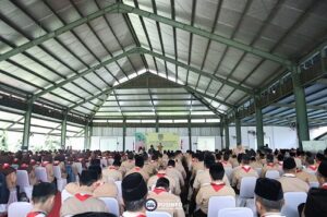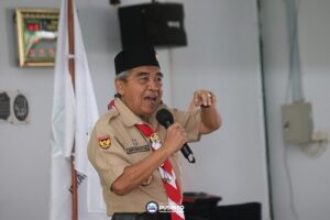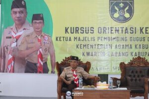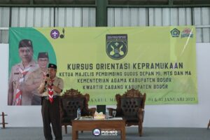 Kak Djoko Mursito, Ketua Komisi Pembinaan Anggota Dewasa Kwartir Nasional menyampaikan materi kepada peserta Kursus Orientasi bagi Ketua Mabigus MI, MTs dan MA se-Kabupaten Bogor di Aula Pondok Pesantren Darul Muttaqien, Parung pada Rabu, (4/01/2023)