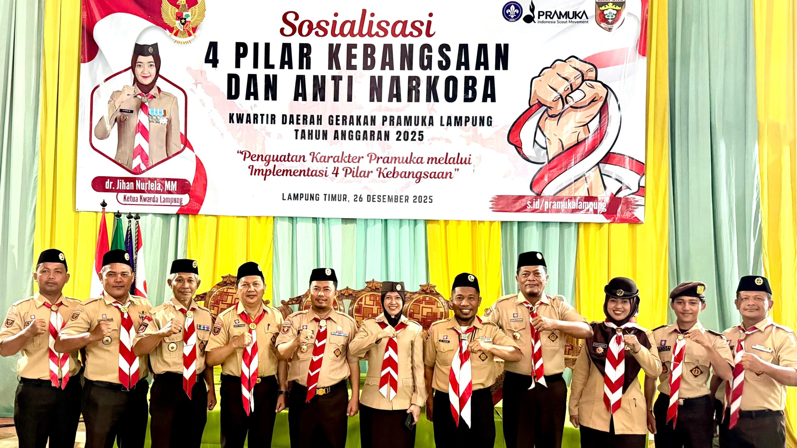 PRAMUKA.ID – Lampung Timur, Kwartir Daerah (Kwarda) Gerakan Pramuka Lampung menyelenggarakan kegiatan Sosialisasi 4 Pilar Kebangsaan dan Anti Narkoba pada Jumat (26/12/2025) pagi di Aula SMK Ma’arif NU 1 Purbolinggo, Kabupaten Lampung Timur.