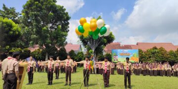 Dengan Menerbangkan Balon ke udara yang membawa tulisan Selamat Hari Pramuka 63 dan Hari santri 2024 dan diakhiri dengan memotong kue Hari Pramuka dan Hari santri