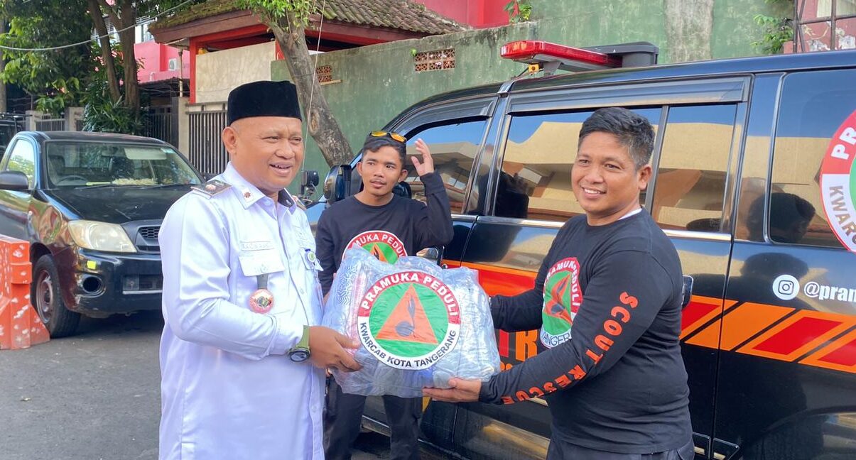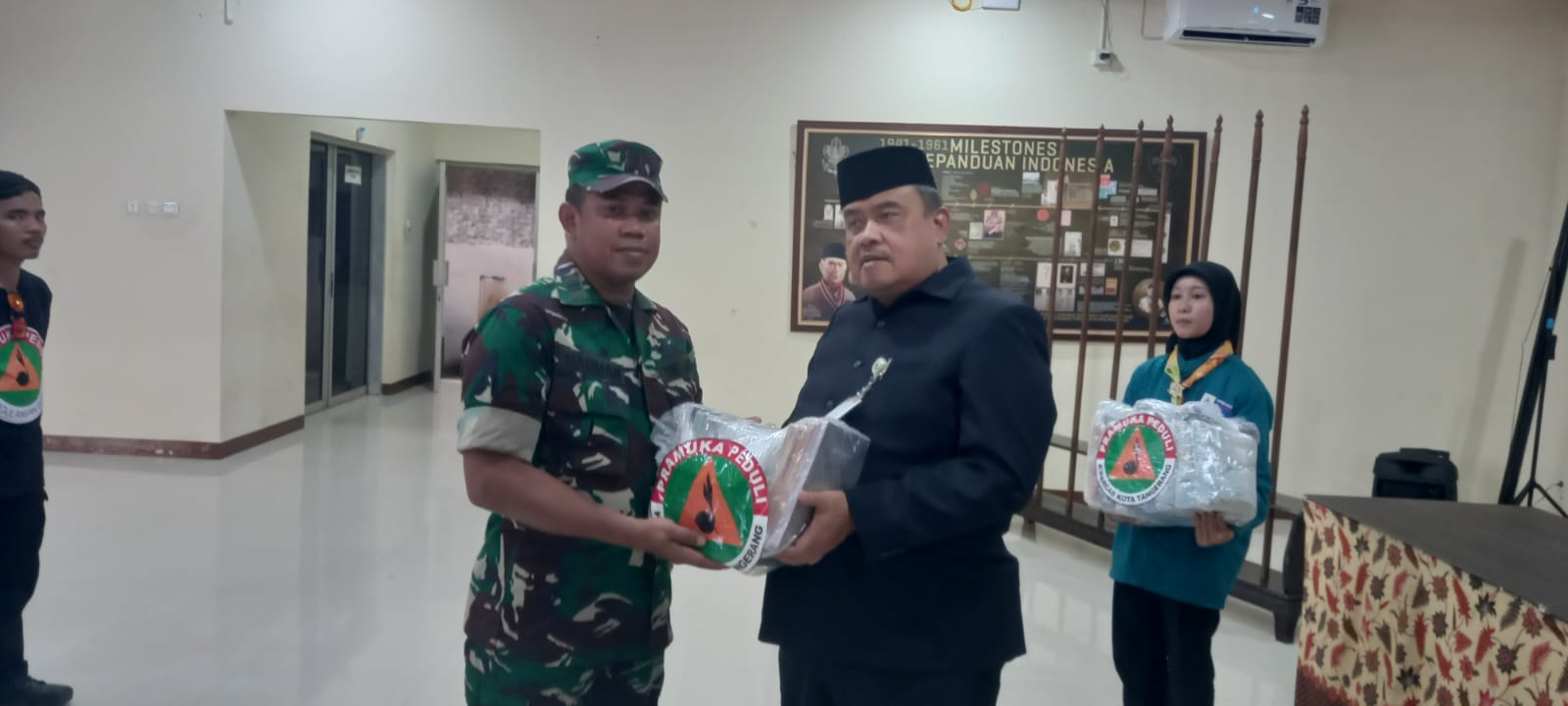 Ketua Kwarcab Gerakan Pramuka Kota Tangerang, Kak Suli Rosadi dan Wakil Ketua Bidang Keuangan Sarana Prasarana Kwarcab Kak Kaonang melepas pemberangkatan bantuan itu, di Grha HM Masduki Jalan Mayjen Sutoyo Kelurahan Sukarasa, Rabu sore 24 Desember 2025.