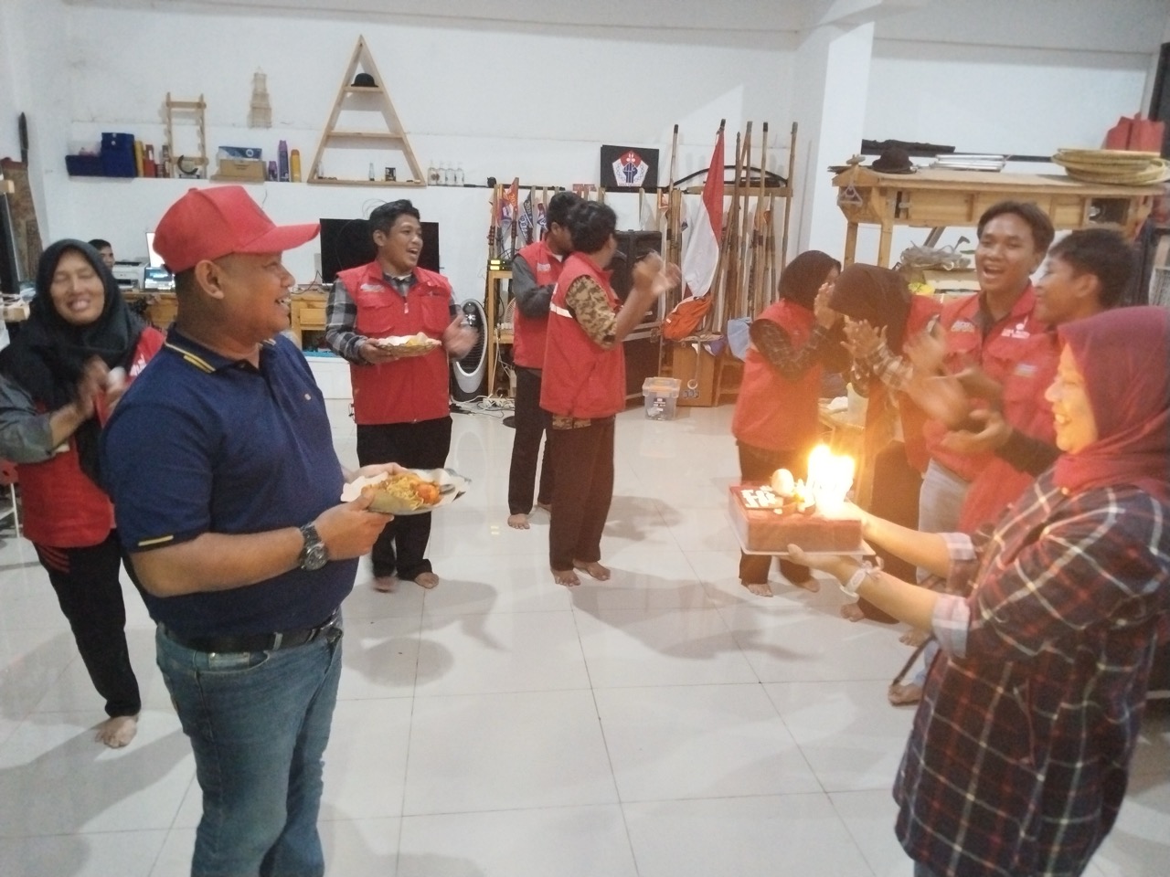 Kepala Dinas Pemuda Olahraga (Dispora) Kota Tangerang yang juga Ketua Majelis Pembimbing Rintisan Saka Patriot Kwarcab Gerakan Pramuka Kota Tangerang, Kak Kaonang bersama Pimpinan Saka Patriot, Kak Bobby Yunandar membaur dengan para pembina, pelatih dan anggota Saka Patriot dalam malam syukuran satu tahun di Sanggar Bhakti, Stadion Benteng Reborn, Sabtu malam 10 Januari 2026.