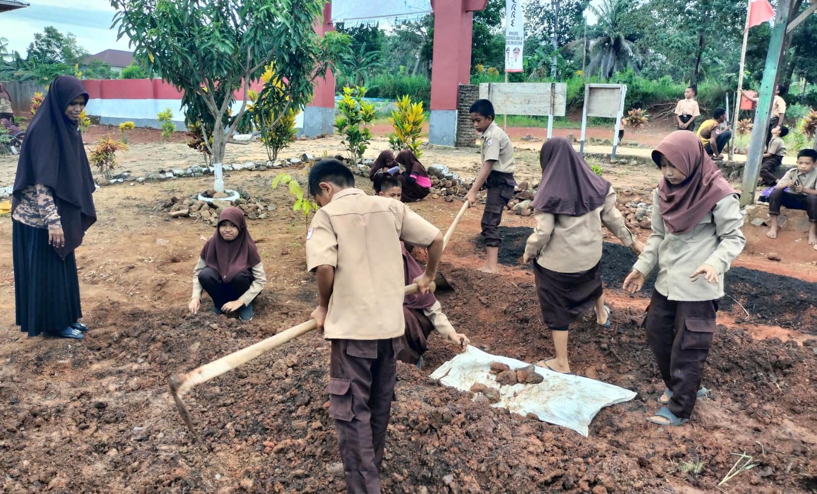 Dengan semangat dasa darma, anak-anak ini bahu-membahu mengolah dengan mencangkul tanah dan mengangkat pupuk organik dan menaburi tanah yang diolah. Tanpa canggung, mereka mengolah tanah secara manual, menata bedengan dengan rapi, hingga memanfaatkan limbah botol plastik sebagai penahan struktur tanah. Aksi kreatif ini tidak hanya mengajarkan cara bercocok tanam, tetapi juga menanamkan kesadaran akan pentingnya menjaga lingkungan melalui daur ulang.